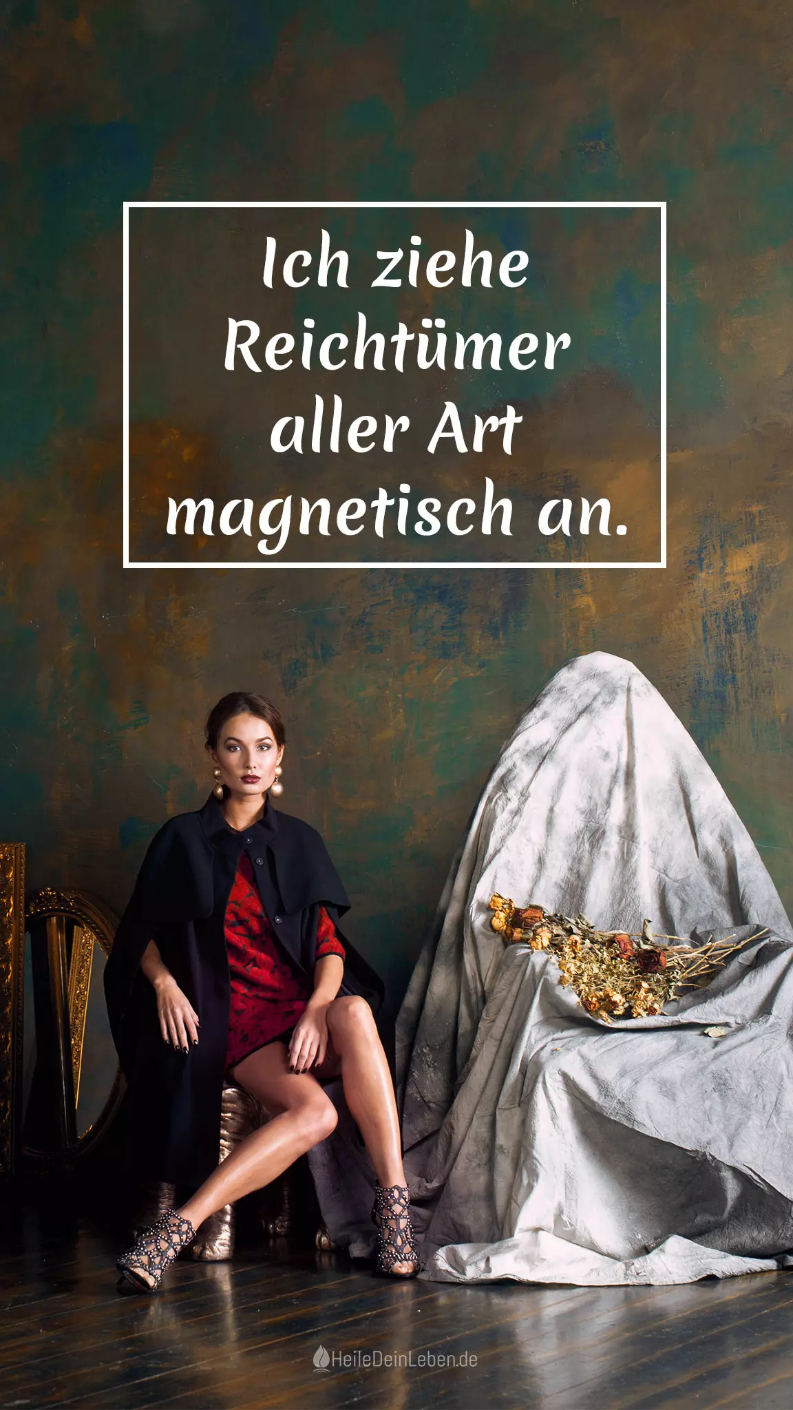 Mit den Reichtums-Affirmationen auf dieser Seite bringst du Neues in dein Leben. Stell dir beim Sprechen dieser Affirmation vor, wie deine Aura sich auf Wohlstand einstellt. Deine Ausstrahlung wirkt magnetisch auf Reichtümer aller Art.